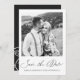 Elegante caligrafia e foto floral em preto e branco no verso do cartão de convite de casamento para salvar a data.
