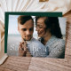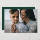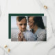 Anuncie seu casamento em estilo com estas cartões salve a data elegantes. O design apresenta a foto horizontal de sangria de cheio com "Save the Date" em letras brancas. Personalize a foto moderna salve o cartão de data com seus nomes, data do casamento, local do casamento e detalhes do convite. A parte de trás do cartão contém detalhes adicionais, como o site do seu casamento em letras brancas em um sólido fundo verde de caça.