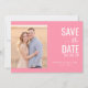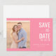 Este cartão de aviso de casamento apresenta um design moderno e minimalista com um layout dividido. O lado esquerdo exibe uma foto com foco suave de duas pessoas em um ambiente externo, enquanto o lado direito tem um fundo rosa sólido com tipografia branca e limpa. O texto é organizado hierarquicamente, usando uma mistura de fontes sans-serif e script para um visual contemporâneo e elegante. A paleta de cores inclui rosa pastel e branco crocante, criando um clima alegre e convidativo perfeito para celebrar uma ocasião especial.