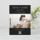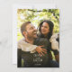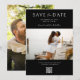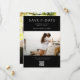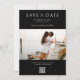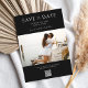 Este casamento moderno salva os cartões de data e apresenta uma elegante tipografia minimalista em cor branca sobre fundo preto ao lado de sua própria foto personalizada.