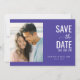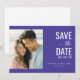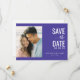 Este cartão de aviso de casamento apresenta um design moderno e minimalista com um layout dividido. O lado esquerdo exibe um espaço reservado para foto com tema de praia, enquanto o lado direito é preenchido com um fundo roxo-azulado profundo que destaca a tipografia elegante. Uma combinação de fontes sans-serif em negrito e cursivas adiciona interesse visual, criando um clima alegre e convidativo perfeito para anunciar o seu dia especial. A paleta de cores harmoniosa inclui tons suaves de azul-verde e tons de pêssego discretos, melhorando o apelo estético geral.