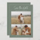 Green Simple Calliographic Modern Four Photo Save the Date apresenta um trio de fotos na frente, junto com o moderno e mínimo tipo. Uma grande foto solteiro no fundo, com o seu site de casamento.