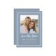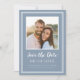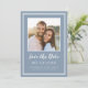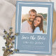 Salve o design de cartão de anúncio de foto do noivado de de data apresenta a sua imagem de noivado quadrado favorita emoldurada por um quadro quadrado branco nítido em um plano de fundo Dusty Blue. Personalize e compartilhe seus detalhes de noivado e casamento com seus convidados em letras brancas e roteiro nítidos. O design é completado com um quadro duplo moderno em branco. A parte traseira do cartão é azul estável.(Para melhor posicionamento da sua imagem, use uma ferramenta de edição de fotos para centralizar e recortar ANTES de carregar no site do Zazzle.) Entre em contato com invitationsuites@gmail.com ou use a função de mensagem com perguntas ou solicitações de cores personalizadas.