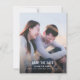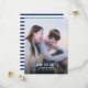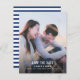 Estilo minimalista, salve a foto da data com fontes modernas. Há um gradiente na parte inferior da foto, que é opcional. A parte de trás tem listras azuis e brancas. Fontes e cores personalizáveis.