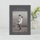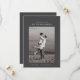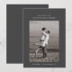 O cartão de fotográfico de save-the-date apresenta uma única foto centralizada do casal. Acima da foto, os nomes deles são exibidos em uma fonte limpa e moderna. Abaixo, a data e o local do casamento são escritos de forma organizada. O design é minimalista com muito espaço em branco, focando na simplicidade e elegância.