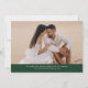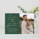 Anuncie seu próximo casamento em estilo com esta tenda foto verde do Modern Script, salve o cartão de data! O design apresenta "Save the Date" (Salvar a data) exibido na caligrafia branca com fundo verde escuro. Personalize a frente do minimalista, salve a data com seus nomes, data do casamento, local e foto vertical do noivado. A parte de trás do cartão exibe uma foto horizontal com o site do seu casamento mostrado abaixo. O verde-chic salva a data a escolha perfeita para casamentos modernos.