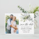 Moderna Caligrafia Script Elegante Aquarela Verde Botânico Anúncio do Noivado de Casamento Foto Salvar O Cartão de Data inclui folhas de eucalipto, folhagem botânica verde, folhas azuis empoeiradas e outro belo verde botânico.