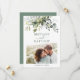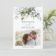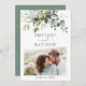 Anúncio de Noivado de Casamento com Molerce Botânico Moderno Elegante Aquarela Salva o Cartão de Data inclui folhas de eucalipto, folhagem botânica verde, folhas azuis empoeiradas e outras lindas culturas botânicas. Foto do casal.