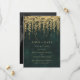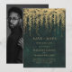 Uma ilustração de galhos de árvore com folhagem exuberante e selvagem e folhagem pendente, sobreposta digitalmente com dourado, sobre um fundo esmeralda brilhante, decora este convite de save the date de casamento de primavera verão outono ou inverno com tema de floresta encantada. Um save the date elegante e moderno para um casamento de conto de fadas. Perfeito para noivas que amam o cenário de floresta de conto de fadas, o tema de floresta de fadas ou jardim de fadas e esmeralda e dourado.