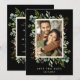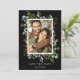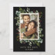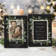 Este convite de salva data de casamento apresenta eucalipto pintado aquarela, folhas verdes, bagas vermelhas, ramos de pinheiro e uma moldura retangular em dourado falso com texto personalizado no verso. Para personalização mais avançada deste design, clique no link "Personalizar ainda mais". Itens correspondentes também estão disponíveis.