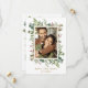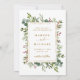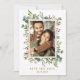 Este convite de save the date de casamento apresenta eucalipto pintado à aquarela, folhas verdes, bagas vermelhas, galhos de pinheiro e uma moldura retangular dourada falsa com texto personalizado no verso. Para personalização avançada deste design, clique no link "Personalizar ainda mais". Itens correspondentes também estão disponíveis.