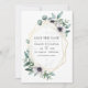 Convite de casamento com eucalipto trendy e flores de papoula em tons pastéis com moldura geométrica dourada e tipografia elegante. Ideal para qualquer tema ou casamento de jardim.