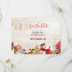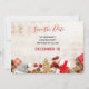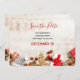 A festa de Natal salve o cartão de data com uma fotografia rústica. Madeira marrom-clara com vários elementos de Natal ao longo do fundo. Presentes de Natal, estrela, renas, bolhas e algumas frutas de férias.