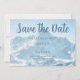 Este lindo cartão de Save the Date de montanha apresenta uma poderosa fotografia de montanhas nevadas no inverno. Adicione os detalhes do seu evento em azul sobre as colinas nevadas. Fotografia perfeita para um casamento de inverno em uma estação de esqui.