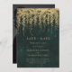 Uma ilustração de galhos de árvore com folhagem verde exuberante e selvagem e folhagem pendente, sobreposta digitalmente com dourado, sobre um fundo esmeralda brilhante, decora este convite de save the date de casamento de primavera verão outono ou inverno com um tema de floresta encantada. Um save the date elegante e moderno para um casamento de conto de fadas. Perfeito para noivas que amam o cenário de floresta de conto de fadas, o tema de floresta de fadas ou jardim de fadas e esmeralda e dourado.