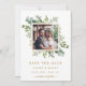 Este convite de casamento com foto para salvar a data apresenta folhagem de eucalipto pintada à aguarela, folhas verdes e uma moldura quadrada dourada. Para personalização avançada deste design, clique no link "Personalizar ainda mais". Itens correspondentes também estão disponíveis.