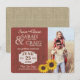 Salve a data rústico com madeira de celeiro vermelha com foto acentuada com girassóis e design de aniagem nas costas. Personalize o texto conforme preferido e adicione um endereço de site de casamento ou outras informações nas costas.