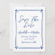 Save the Date de Casanço Azul Caprichoso Desenhado à Mão. Este cartão Save the Date azul e branco inspirado na Europa apresenta um design limpo e minimalista perfeito para casais que buscam elegância atemporal. Uma moldura sutil desenhada à mão com corações azuis encantadores em cada canto envolve delicadamente os detalhes do seu casamento, apresentados em uma mistura de fontes em estilo caligráfico e manuscrito para um visual que é ao mesmo tempo elegante e pessoal.