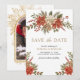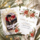 Surpreenda seus convidados com este elegante cartão de Save the Date com belas flores de poinsettia vermelhas e folhas de pinheiro rústicas.