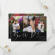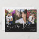 Guarde o cartão com três fotos em uma colagem limpa de um lado e uma foto maior do outro. Salvar a data é gravada em um estilo de caligrafia mais leve em branco a preto. Adicione seus nomes e informações de casamento. No verso, você pode adicionar seu site de casamento também.