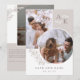 Cartão de save the date frente e verso em branco e taupe com suas iniciais, fotos sobrepostas e verde com fontes limpas e elegantes. Cartão de save the date com foto e design moderno personalizado com seu monograma e fotos, dois de um lado e um do outro.