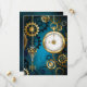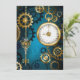 Turquesa, texturizada, fundo steampunk com latão e engrenagens douradas, chave prateada e relógio. Estilo Steampunk.