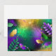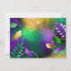 Fundo de grãos de cereais, iridescentes, textualmente, com manchas roxas, amarelas e verdes, decoradas com penas e miçangas brilhantes. feriado Mardi Gras.
