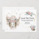 Um crânio de veado em aquarela com chifres majestosos adornados com rosas cor de rosa; flores de anêmona; penas e cristais repousam contra um borrão abstrato bege pálido rodeado por partículas douradas falsas. À direita há um círculo ondulado dourado falso abstrato que enquadra modelos de texto. Uma linda planta em vaso de cerâmica recheada com folhagens, rosas e uma pena repousa no canto inferior direito. Personalize a redação; adicione uma cor de fundo e adicione informações adicionais no verso ou, se não for necessário, limpe o modelo.