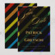 Announce your wedding day in style with this gay men wedding save the date card — bold diagonal Progress Pride stripes on sophisticated black with "Save the Date" in flowing gold script, the grooms' full names, wedding date, and "Formal invitations to follow" in gold typography. The first piece your guests will receive from the Gay Men Wedding Elegant Rainbow collection — a complete suite of coordinating stationery and accessories designed for two grooms, available in this store.