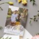 Lindo e exclusivo cartão de salve a data com uma sobreposição de gossamer com salve a data cortado para que sua foto apareça em uma linda escrita espiralada. Adicione outra foto no verso junto com os detalhes do seu casamento.
