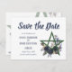 Enviar um design de modelo de Manipulação Floral Personalizada do Wiccan Salve the Date com um palco verde de caçador com rosas pretos e elementos florais góticos sobre um fundo branco.