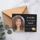 Uma foto Salve o cartão de data para uma graduação. Na frente: adicione sua própria foto vertical do formando. Quadro do arco fotográfico. Um fundo preto clássico, texto branco. Modelos para um nome e data. O nome e o texto: Salvar a Data são escritos com um script de estilo moderno com letra manual. Com um boné, tassel superior. Voltar: detalhes da festa.