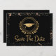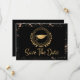 Eu gosto de projetar arte para formandos. Este é um quadro de abertura em ouro clássico, simples e elegante, e preto com emblema dourado Salve o cartão de anúncio Data. Texto de estilo moderno. Adicione a sua própria mensagem no verso dos cartões, dando detalhes à sua família e amigos para salvar a data de uma cerimônia de graduação, evento, festa ou outra ocasião. O estilo de logotipo design inclui folhas de louros, estrelas e um boné de formatura.