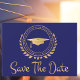 Eu gosto de projetar arte para formandos. Este é o ouro clássico moderno, simples e elegante, e o cartão azul de lançamento Salvar a Data. Texto de estilo moderno. Adicione a sua própria mensagem no verso dos cartões, dando detalhes à sua família e amigos para salvar a data de uma cerimônia de graduação, evento, festa ou outra ocasião. O estilo de logotipo design inclui folhas de louros, estrelas e um boné de formatura.