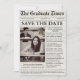 Esta placa de graduação "Salvar a Data" apresenta um design único estilo de jornal, com uma foto do formando em seu boné e vestido. O layout limpo destaca os detalhes do evento em tipografia ousada e moderna. É uma maneira na moda, memorável de anunciar o grande dia.