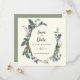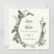 Este veraneio de inverno no casamento de marfim... salve o cartão de encontro é perfeito para um casamento clássico. A design de outono ou inverno moderna apresenta uma elegante paisagem verde-aquática e folhas de eucalipto de oliveira com uma sensação de feriado rústica.