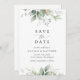 Convide amigos e família de estilo e defina o tom para seu dia especial com este charmoso cartão de data. Design apresenta folhas de eucalipto e verde em fundo branco.
