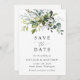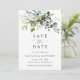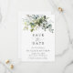 Convide amigos e família de estilo e defina o tom para seu dia especial com este charmoso cartão de data. Design apresenta folhas de eucalipto e verde em fundo branco.