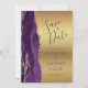 A borda esquerda deste elegante casamento moderno salve o cartão de data apresenta uma borda de agata púrpura aparada com falso brilho dourado. O texto personalizável combina a escrita manual de cinzas de carvão, fontes em copperplate e itálico em um fundo de folha de papel azul. O verso apresenta um design de agate roxo e dourado correspondente.