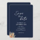 Azul profundo 'salve a data' para casamentos, com flores de damasqueiro e folhagem de jardim. Um design botânico contemporâneo simples, mas elegante, inspirado pelo estilo boho vintage, com monograma no verso.