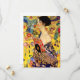 Cartão com pintura de óleo de Gustav Klimt Lady com ventilador (1918). Uma mulher vestindo um quimono azul segura um fã vermelho contra um fundo amarelo colorido de flores e pavões. Um presente de excelente para fãs de arte japonesa e europeia.