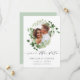 A Elegante botânica geométrica salva as datas apresenta uma foto de noivado favorita cercada por uma coroa geométrica dourada de galhos vibrantes de folhas de feno e morangos de neve, "salve a data" em letra de roteiro de caligrafia, com seus nomes, data de casamento e localização sob o tipo clássico de serra de cinza. Matizes vibrantes de folhagem verde, sage macia e cinzas e formas geométricas douradas para este esquema de cores fresco e harmonioso. O verso apresenta um fundo de sábio. *** Para solicitação personalizada, escreva um email em citronelladesign@gmail.com.