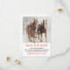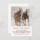 Salve o cartão de dia com uma fotografia de 2 cavalos belgianos a puxar um trenó. Flocos de neve suavemente caindo com pinheiros cobertos de neve no fundo.