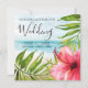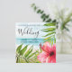 Tropical Save the date card apresenta sotaques elegantes de caligrafia, noiva e noiva, data de casamento e localização sobre um fundo de praia de aquarela enquadrados por folhas de palmeiras e uma flor de hibisco rosa. O lado inverso é azul-oceano. Personalize com seus nomes e informações de casamento. Coordena-se com a minha suíte de casamento do Island Paradise.
