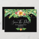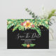 Uma bela cor d'água pintada por design floral com folhas de monstera tropical através das quais bonito luzes brilhantes de cordas aparecem atrás de uma bonito flor amarela e rosa de frangipani. O verde abraça a borda superior da carta e um pequeno buquê com folhagem verde e um solteiro frangipani aparece na parte inferior, o que é repetido na parte de trás. Os elementos são definidos em um plano de fundo preto que pode ser alterado para qualquer cor de sua escolha. Personalize as modelos para se adequar à sua celebração especial.