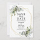 Verde Botânico Elegante moderno Salve a Data O Cartão inclui folhas de eucalipto, folhagem botânica verde, folhas azuis empoeiradas e outro belo verde botânico. Dourado quadro geométrico. Foto de volta.