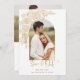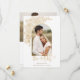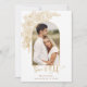 Ouro elegante desenhado à mão como spray de rosas e folhagem desenhado à mão com modelo de fotografia em arco e campos de texto editáveis. A parte de trás apresenta um modelo de foto e campos de texto adicionais.