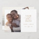 Esta elegante foto do guião dourado salva o cartão de data é perfeita para um casamento simples. O ouro minimalista e o design branco apresentam tipografia romântica rico com estilo de vidro moderno. Personalizável em qualquer cor. Mantenha o design mínimo e a classe, como está, ou personalize-o adicionando seus próprios gráficos e trabalhos de arte.