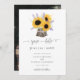 Um pote de flor, feito de latido de árvore e amarrado com fio, repleto de girassóis, lavandas e trigo, faz uma bela ilustração, pintada à mão em aquarela digital, que decora este casamento elegante rústico, exceto a data que também apresenta um modelo fotográfico no verso. Romântico e charmoso, é uma escolha encantadora para um casamento de celeiro, um casamento ao ar livre, um casamento de jardim ou qualquer lugar rústico.