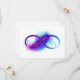 Símbolo infinito com uma bela pena pintada em cores roxas e azuis brilhantes sobre fundo branco.